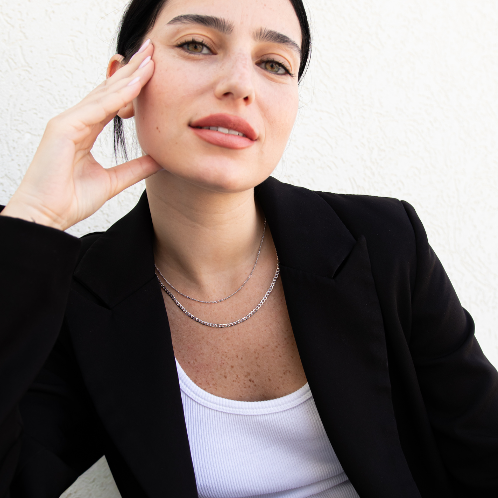 The Flow of Balance Bundle combines the Nagare 3 mm Curb Chain (流れ) and the Ritsudō 1.7 mm Figaro Chain, merging quiet strength with subtle simplicity. Nagare symbolizes the steady rhythm of resilience, while the minimalist chain represents calm clarity in form.