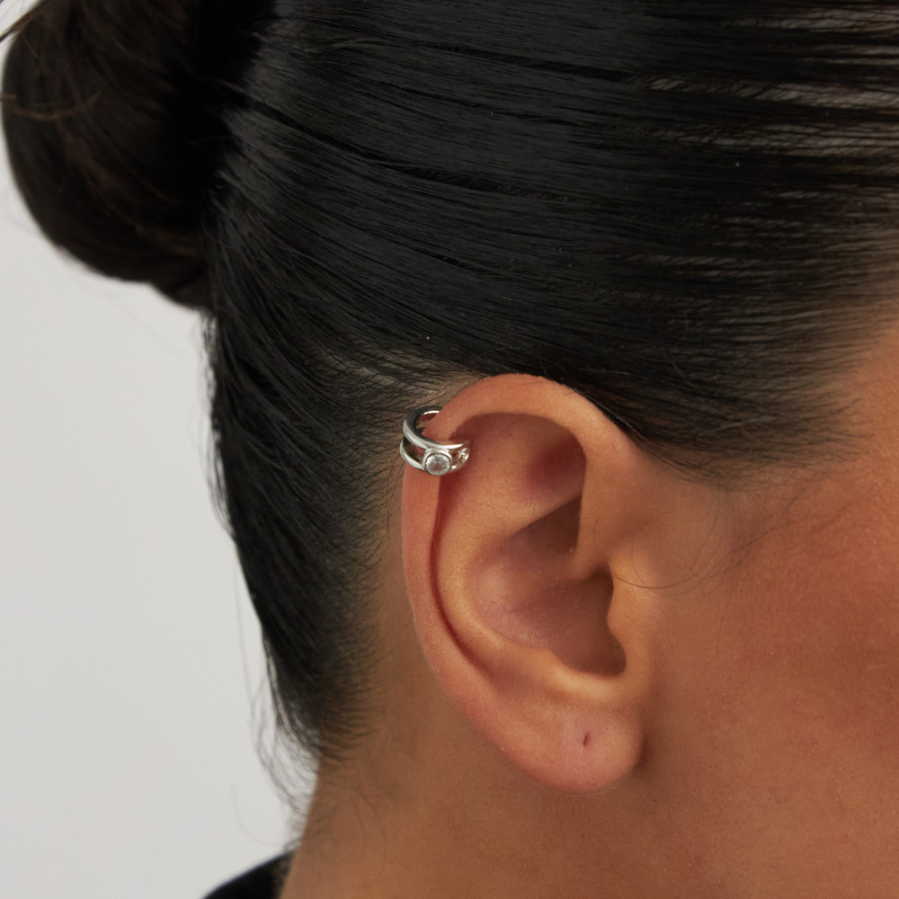 This sleek, non-pierced ear cuff features a brushed medallion detail paired with a clear cubic zirconia accent, bringing together texture, light, and clean modern form.