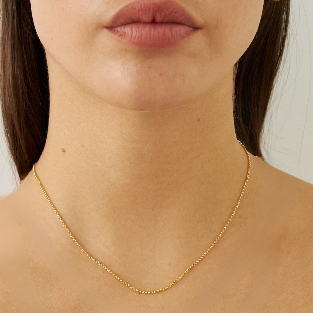 Crafted with perfectly rounded links, this 1.3 mm circle rolo chain reflects balance, connection, and calm presence. Its clean, minimalist form captures the purity of light in motion—subtle yet luminous.