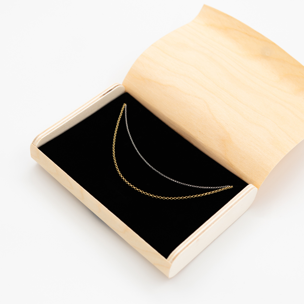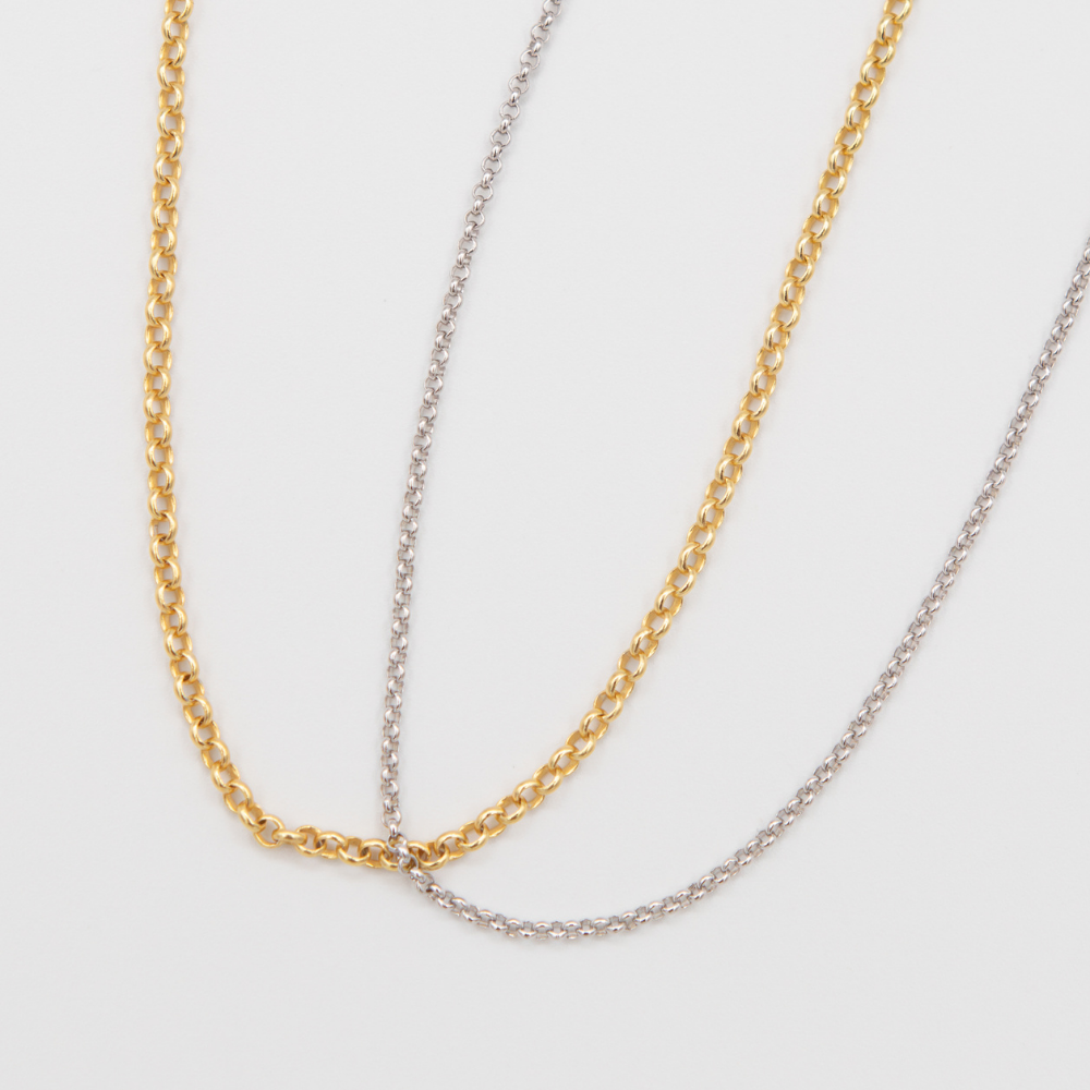 The Layers of Light Bundle pairs the Hikari 2 mm Rolo Chain and the Hikari 1.3 mm Rolo Chain, a minimalist duo that reflects clarity, balance, and quiet presence. Each chain catches light differently, flowing together in perfect harmony.