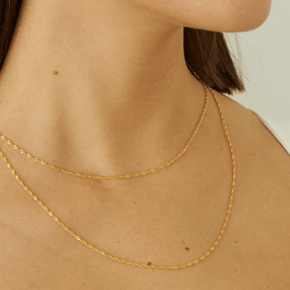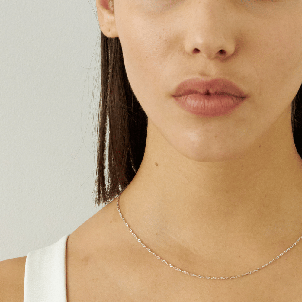 This 1.5 mm twisted Singapore chain reflects the quiet beauty of movement, an elegant spiral that symbolizes change, flow, and energy in motion.
