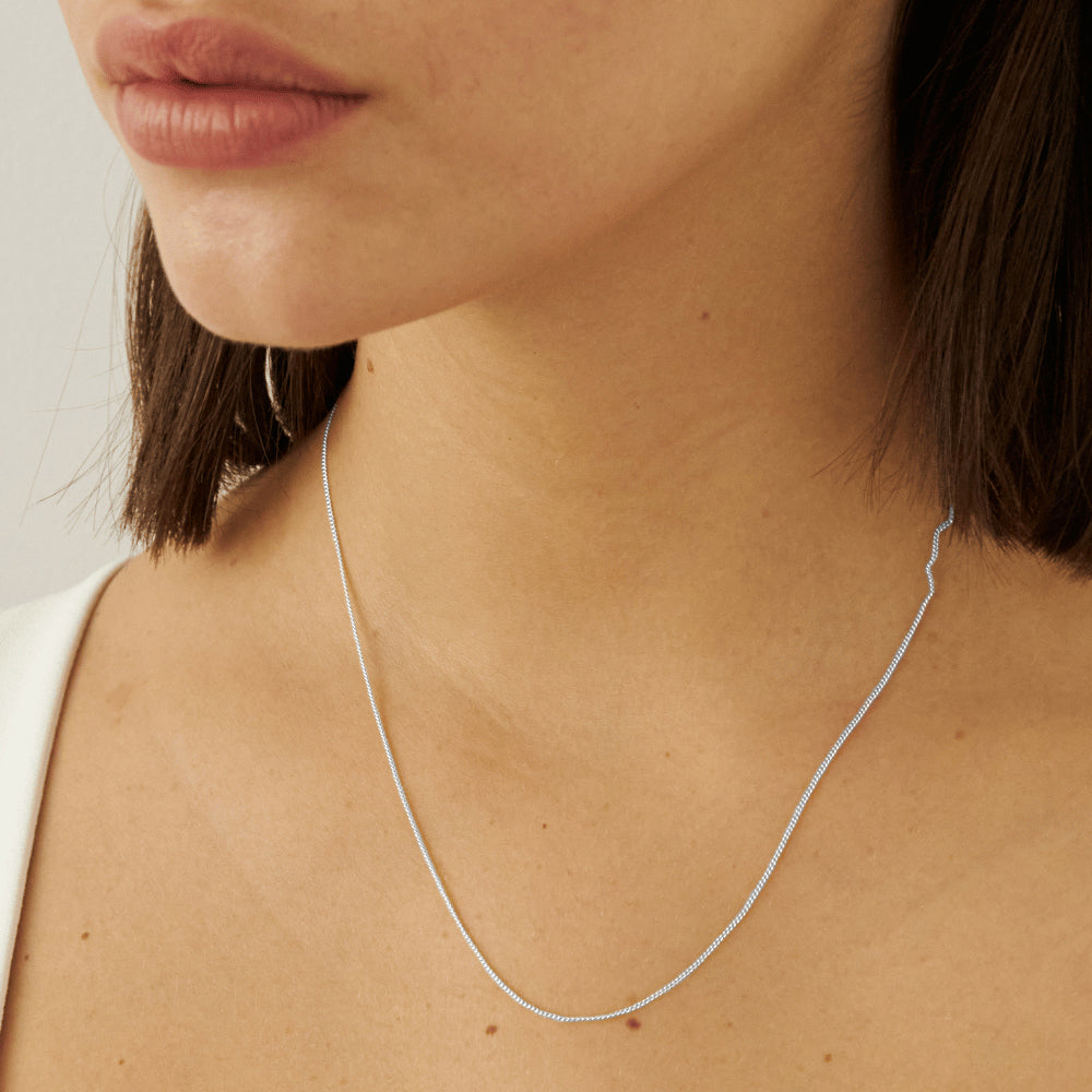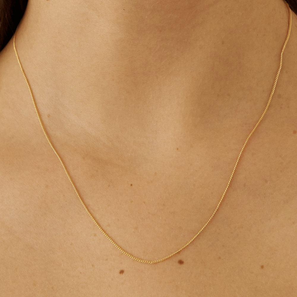 This 1mm curb chain features sleek, interwoven links, symbolizing strength, unity, and the beauty of everyday simplicity. With its clean profile and timeless feel, it offers effortless versatility for layering or wearing solo.