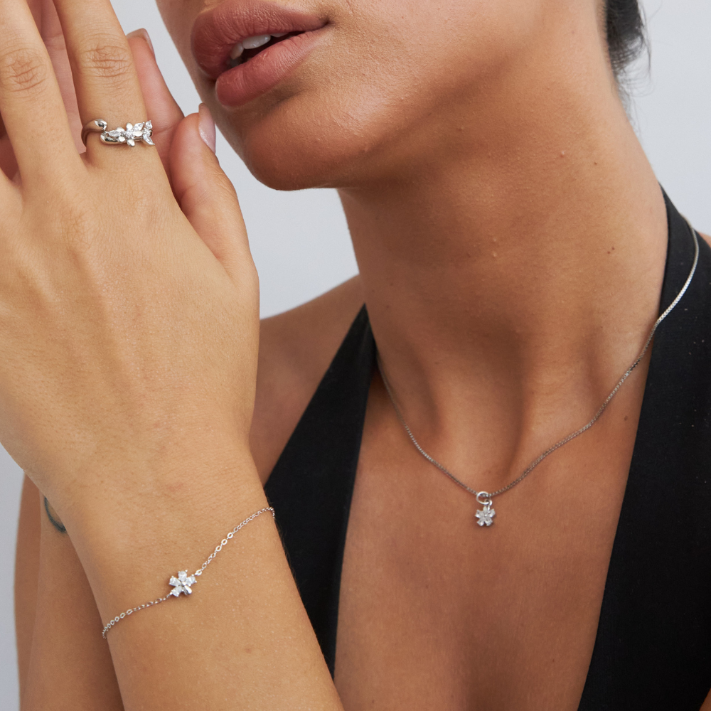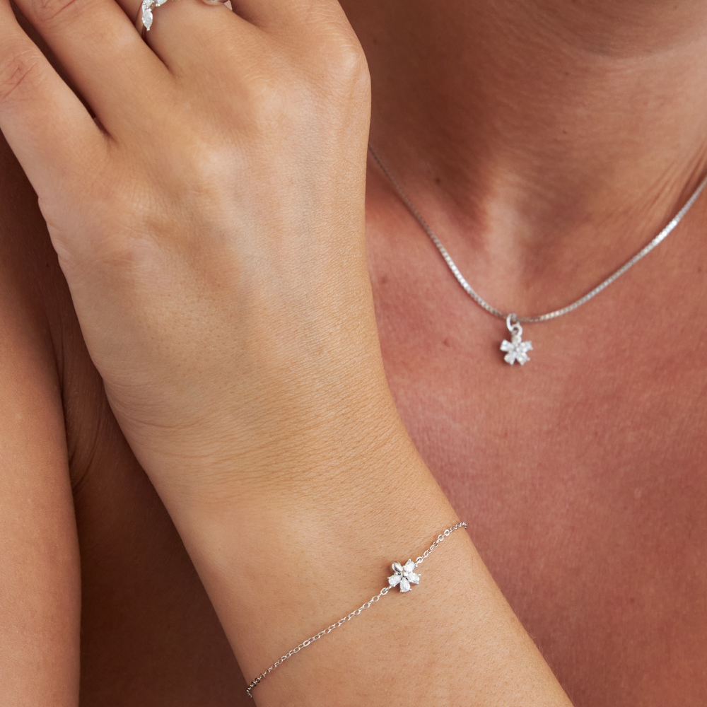 The Sakura Light Bracelet reflects the quiet elegance of cherry blossoms in their most delicate form. Centered on a fine 1mm cable chain, a single sakura flower blooms with brilliance, adorned with hand-set luxury moissanite stones that catch the light with refined sparkle.